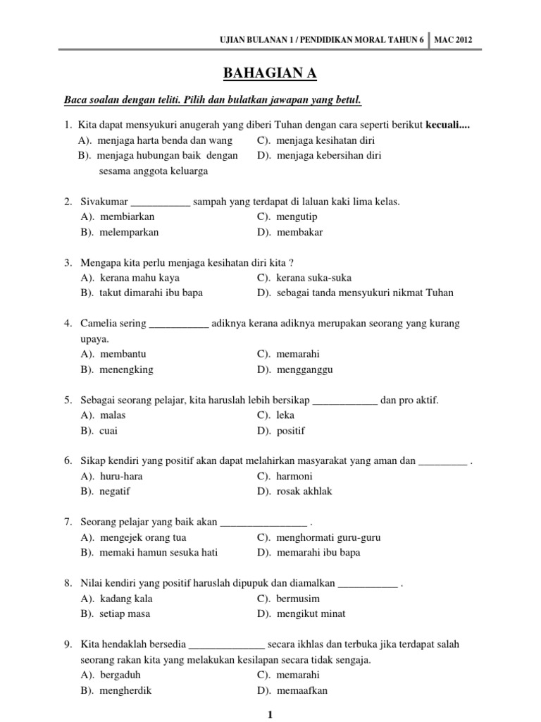 Soalan Pendidikan Moral Tahun 5 Ujian 1 Bulan Mac 2017 1 Docx Bahagian A 20 Markah Untuksoalan 1 Hinggasoalan 20 Bulatkanjawapan Yang Course Hero
